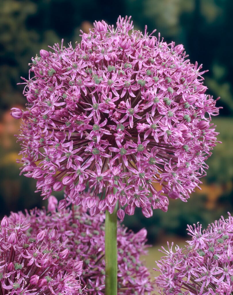 Bulbous herbaceous perennial to 1.2m. Stems emerge in spring with green basal leaves which die back before blooms appear. Bears spheres of tiny star-shaped purple flowers, to 15cm in diameter, in early summer.
