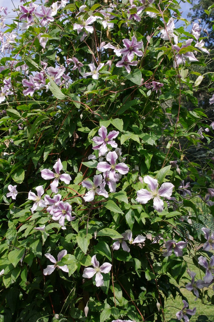 A climber 3-4m high, with green leaves, and flowers, 7-8cm across, composed of four or six pale blue-lilac sepals, with darker bars, and pale greenish-yellow stamens, from midsummer to autumn; many clematis are visited by bees for pollen, and some also provide nectar
