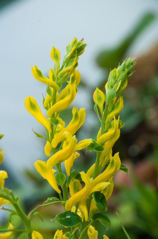 A low-growing, compact perennial to around 25cm high and wide with leaves divided into blue-green, ovate, deeply lobed leaflets. short, upright stems bear racemes of tubular yellow flowers from late spring into summer