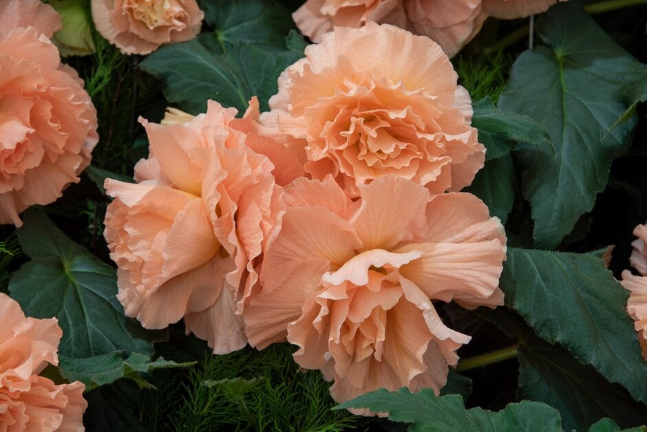 - Tuberhybrida begonias are bushy tuberous perennials with glossy leaves and usually double flowers in small clusters in summer; most are dormant in winter