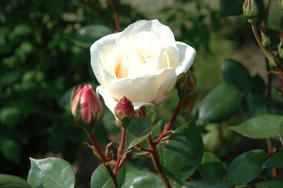 Rosa can be deciduous or semi-evergreen shrubs or scrambling climbers, with usually thorny stems bearing compound pinnate leaves and solitary or clustered flowers. Flowers may be followed by showy red or purple fruits in some varieties.