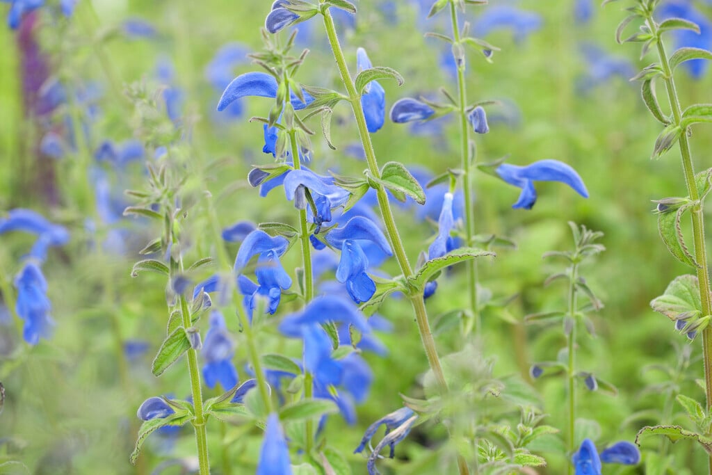 An upright, compact perennial some times grown as an annual, with lance-shaped silvery green foliage, hairy on the reverse, and spikes of sky blue lipped flowers in summer and autumn.
