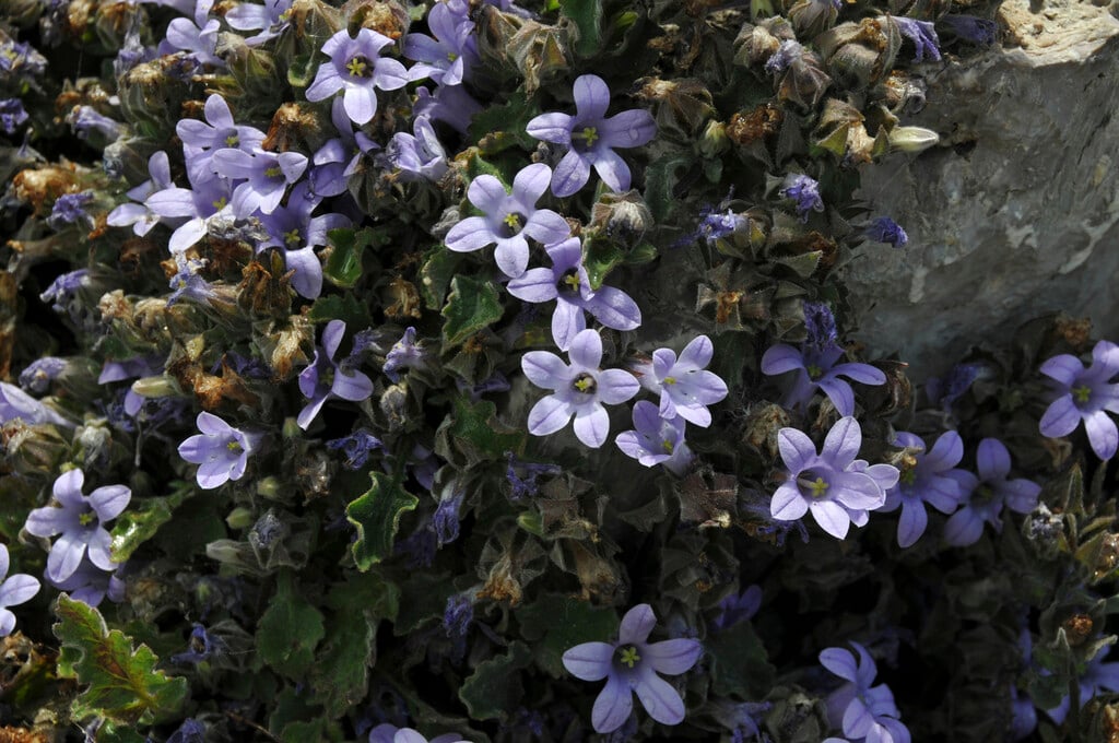 Campanula may be annuals, herbaceous or evergreen perennials, with bell or star-shaped, often blue, flowers in late spring or summer