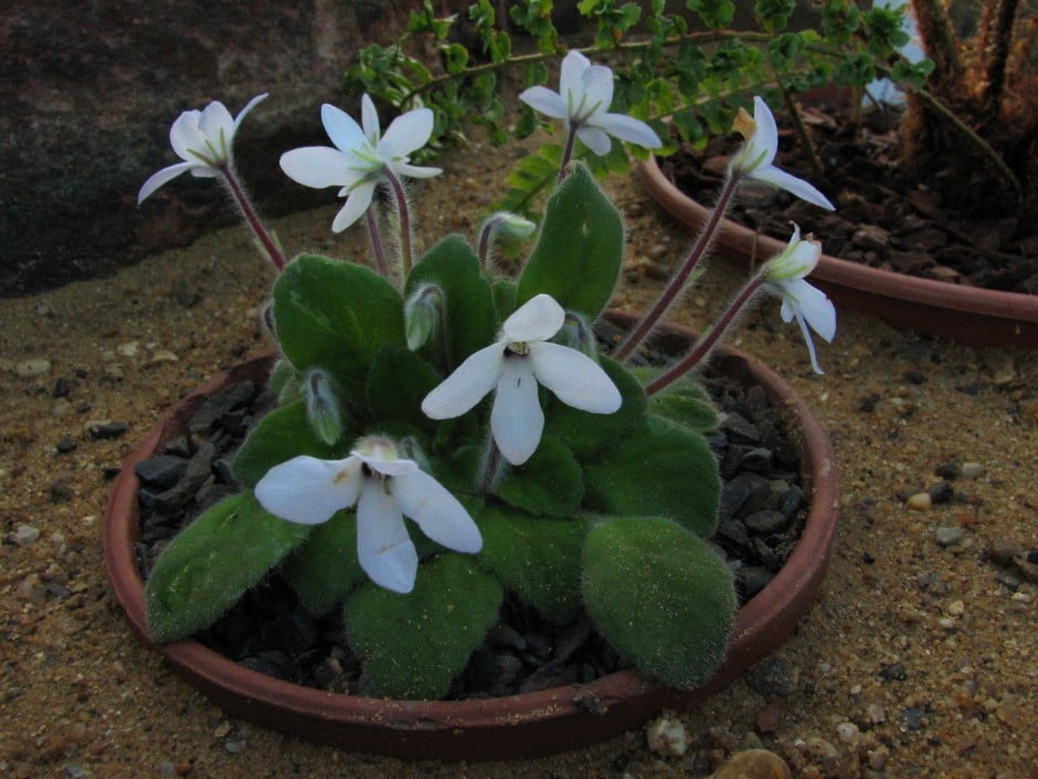 Petrocosmea are evergreen perennials producing low rosettes of fleshy, often felted, lance-shaped or rounded leaves. Five-lobed, tubular to bell-shaped flowers are produced in small clusters in spring