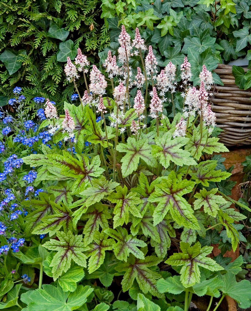 Tiarella are rhizomatous herbaceous perennials forming a clump of rounded, more or less palmately lobed leaves, with very small, star-shaped flowers in terminal panicles or racemes on erect stems