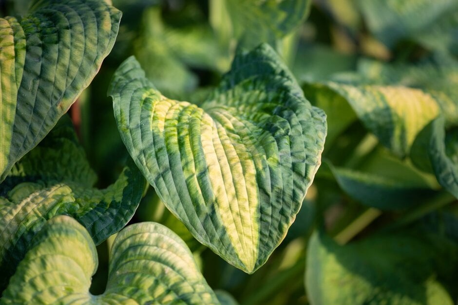 Forms a wide mound of corrugated and variegated leaves with golden-yellow centres and irregular deep green margins that can take on a blue tinge in the spring. White, bell-shaped flowers are borne above the foliage on upright stems to 65cm tall