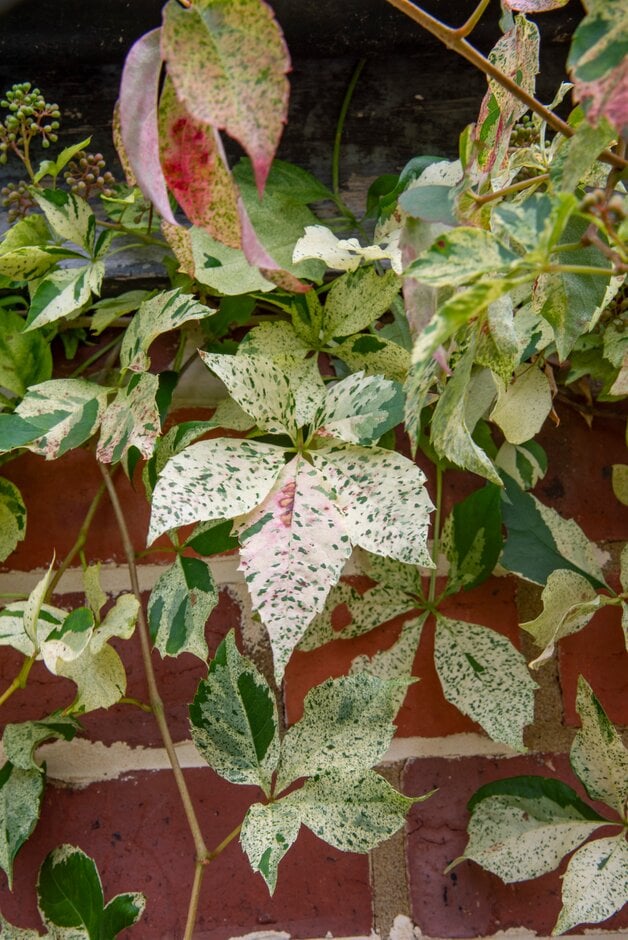 A vigorous, deciduous climber with variegated cream and green divided leaves on clinging vines, which become more pink in colour during the autumn. Parthenocissus quinquefolia are listed on Schedule 9 of the UK Wildlife & Countryside Act as an invasive non-native species. Please see cultivation notes for further details