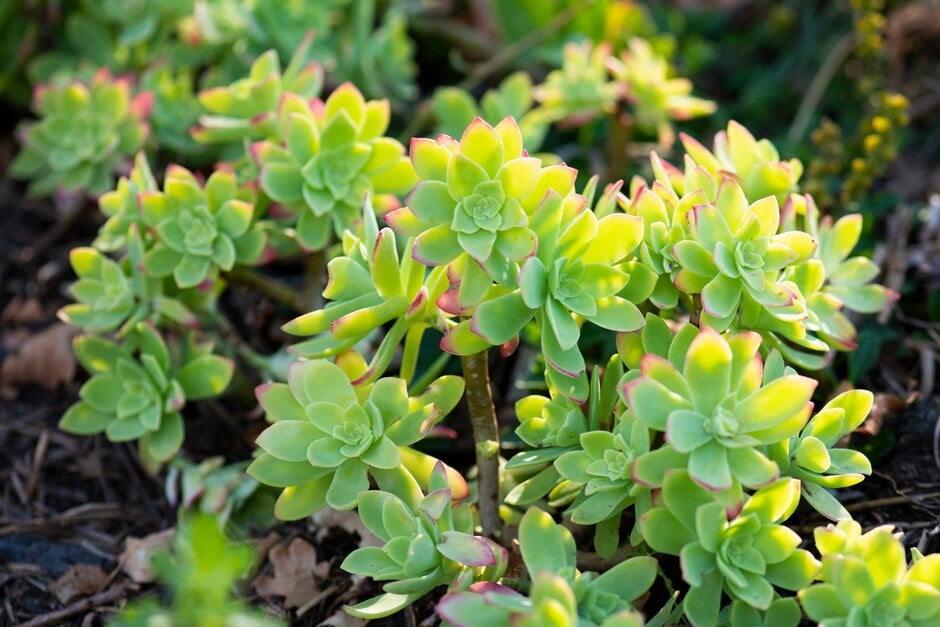A spreading perennial succulent with multiple branching stems, that form rosettes of fleshy, wide grey-green leaves with pointed tips, resembling aeoniums. Leaves flush reddish-pink in strong light or cold temperatures. Flowers are yellow and produced in clusters on short stems in spring