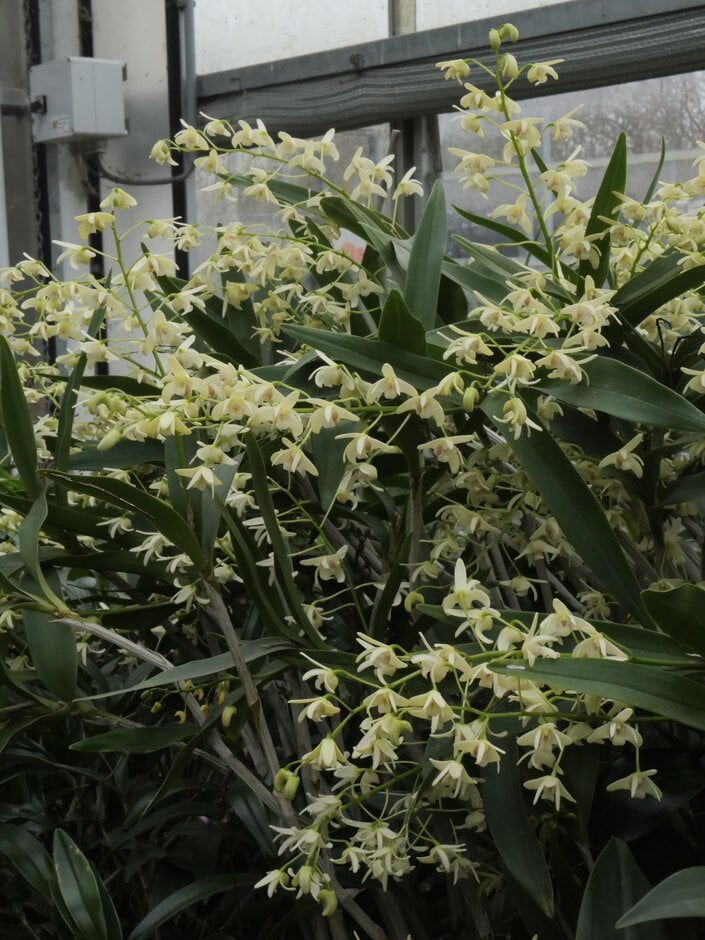 A medium-sized, clump-forming orchid with upright, cane-like stems (pseudobulbs). The stems are 70-90cm long, covered with thin, alternate sheaths. Lance-shaped, dark green, leathery leaves are carried near the tip of each cane. Each leaf is up to 15cm long and 3-4cm wide. Flowering stems emerge from the leaf axils and tips of mature canes and bear a long cluster of 2cm small, scented flowers. The flowers are usually white, sometimes cream, with a hint of pale pink.