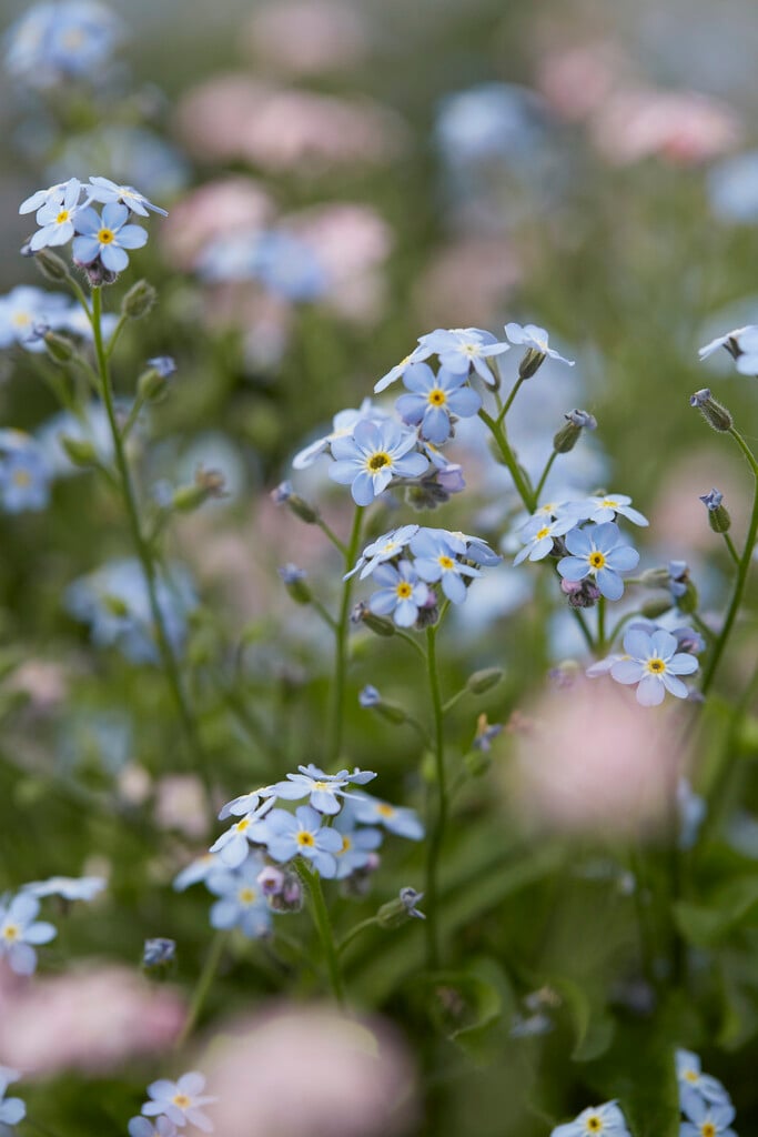 Myosotis can be annuals, biennials or perennials, with simple leaves and clusters of small, salver-shaped blue, yellow or white flowers, with yellow or white eyes, in spring or early summer