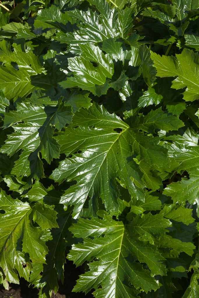 A group of clump-forming perennials, with very large, glossy, shallowly lobed basal leaves up to 1.2m long. Tall, spiny spikes of flowers are produced in late summer; flowers may be white or pale pink, and hooded with green or purple bracts. This group is named for its dense clumps of dramatic foliage, and may not flower as prolifically as some other cultivars