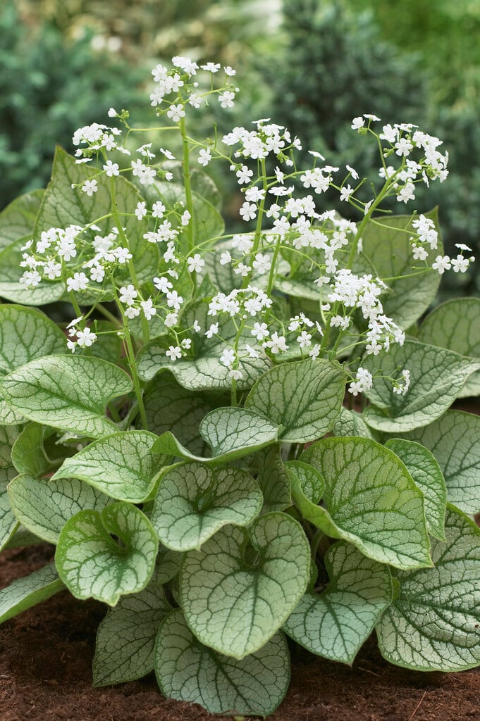 Brunnera are rhizomatous herbaceous perennials with large, ovate or heart-shaped basal leaves and sprays of small bright blue flowers in spring
