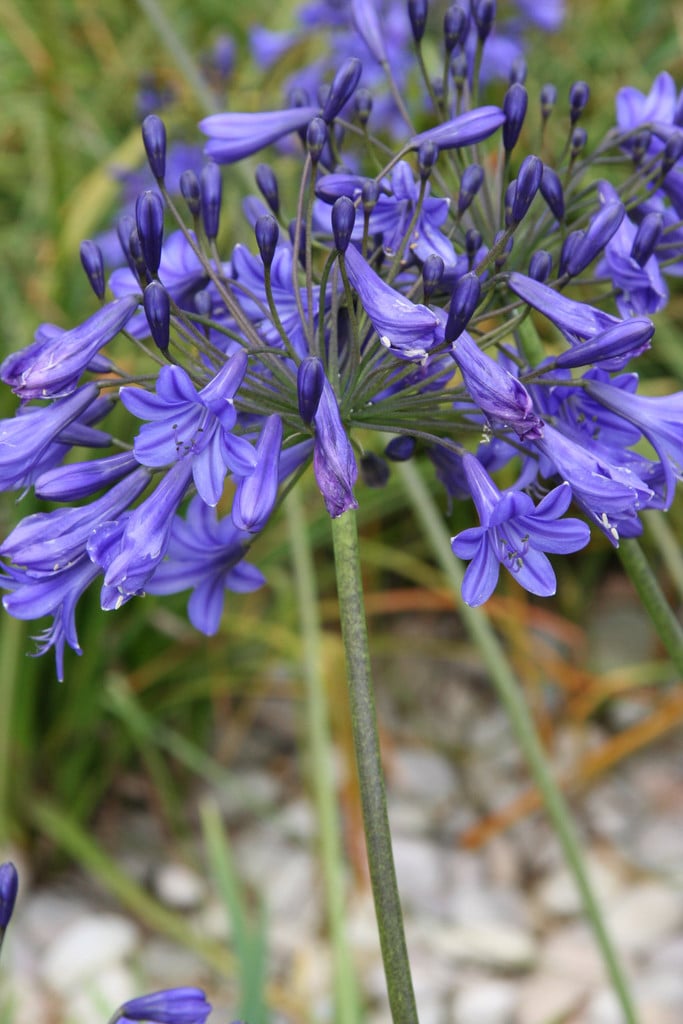 Agapanthus are clump-forming perennials with narrowly strap-shaped leaves, evergreen in some species, and erect stems bearing umbels of funnel-shaped blue or white flowers