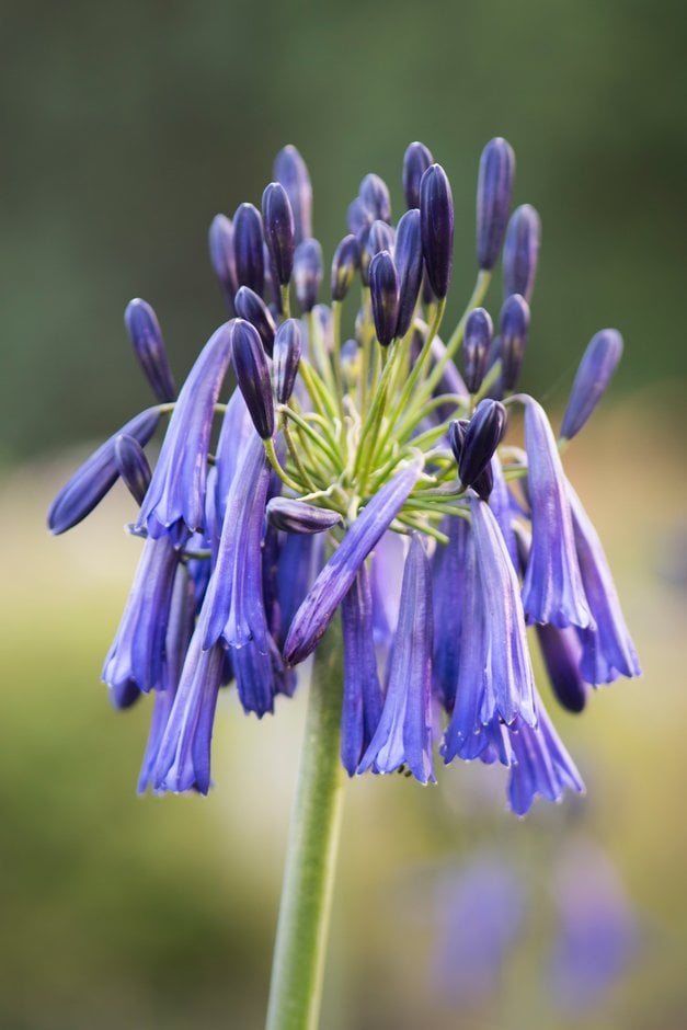 Agapanthus are clump-forming perennials with narrowly strap-shaped leaves, evergreen in some species, and erect stems bearing umbels of funnel-shaped blue or white flowers