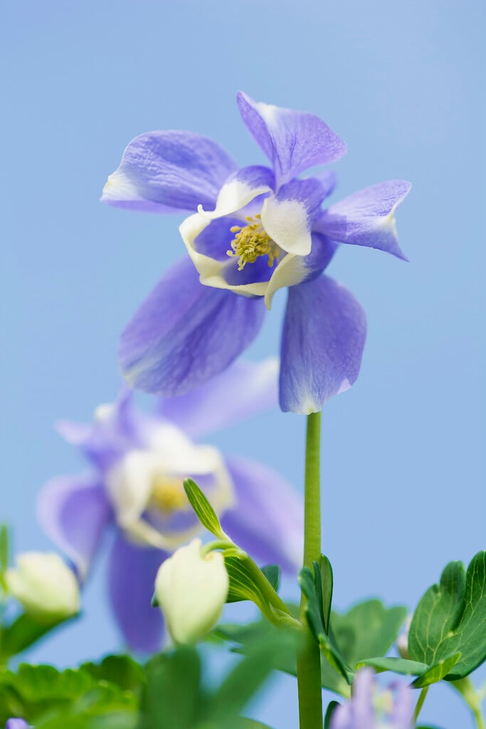 Aquilegia are clump-forming herbaceous perennials with long-stalked, ternately divided basal leaves and erect, leafy stems bearing bell-shaped flowers with spreading, coloured sepals and petals with spurs, on branched stems