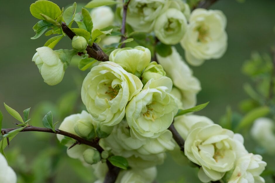 A spreading, deciduous, spiny shrub about 2m tall and wide, with glossy, dark green leaves. Clusters of semi-double lemony-white flowers with greenish centres, in spring are produced along bare stems before the leaves emerge, followed by aromatic green-yellow fruits in autumn. These can be used to make jams and jellies but please see notes on toxicity for further advice