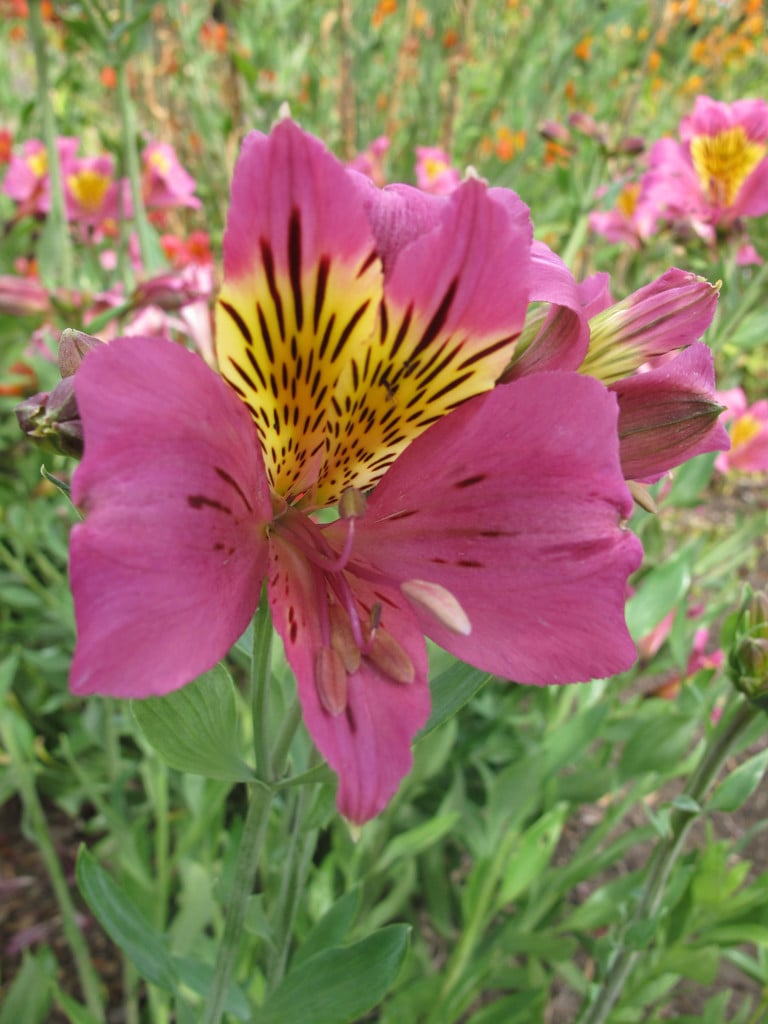 Alstroemeria are fleshy rooted herbaceous perennials forming spreading clumps of erect stems bearing narrowly lance-shaped leaves, with umbels of showy funnel-shaped flowers in summer
