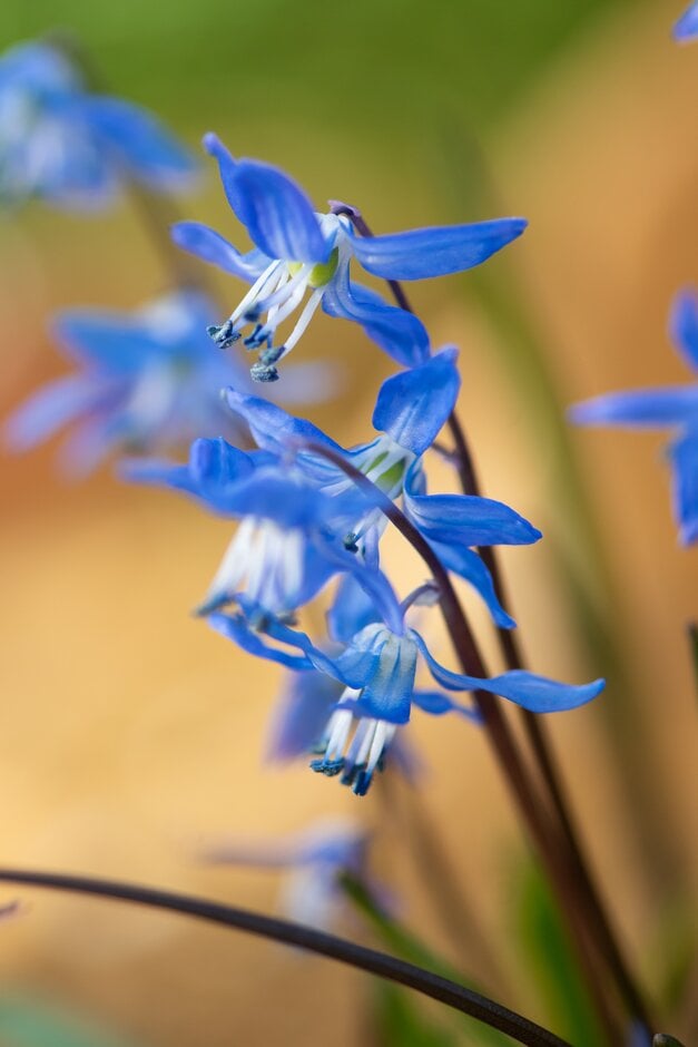 Scilla are perennial bulbs with narrow basal leaves and erect stems bearing racemes of star-shaped, flat or bell-shaped flowers which are often blue