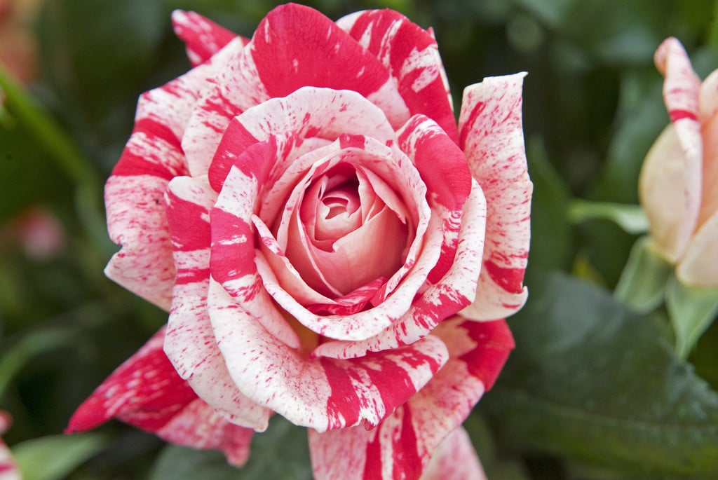 A vigorous, upright, hybrid tea rose about 1m high with glossy green leaves and strongly fragrant, double flowers with cream petals variably striped and flecked with raspberry-pink so that every flower is different, from summer to autumn