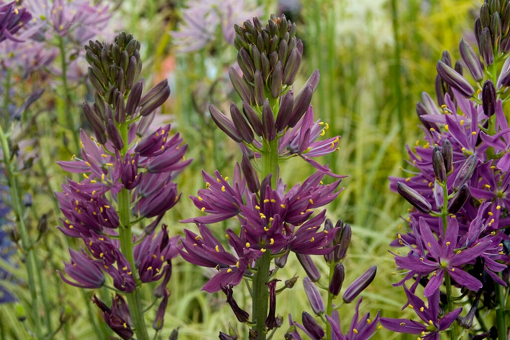 Camassia are bulbous perennials with narrow, channelled leaves and erect racemes of star-shaped violet-blue or creamy-white flowers in early summer