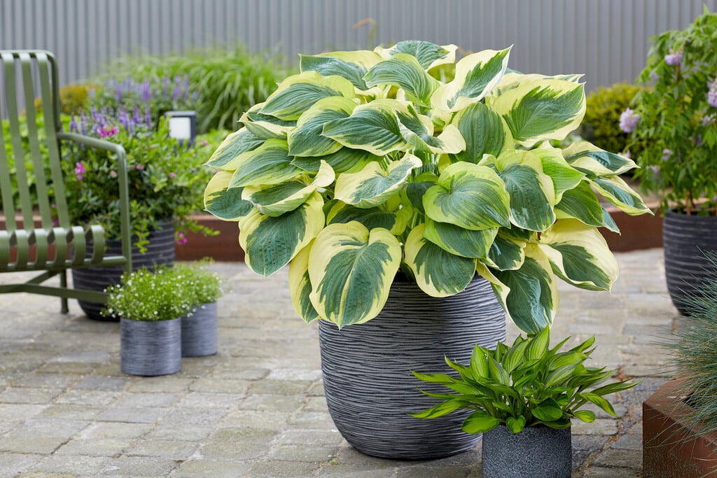 Hosta are clump-forming herbaceous perennials with simple, ovate or lance-shaped leaves, often attractively coloured or variegated, and erect racemes of nodding, funnel or bell-shaped flowers in early summer