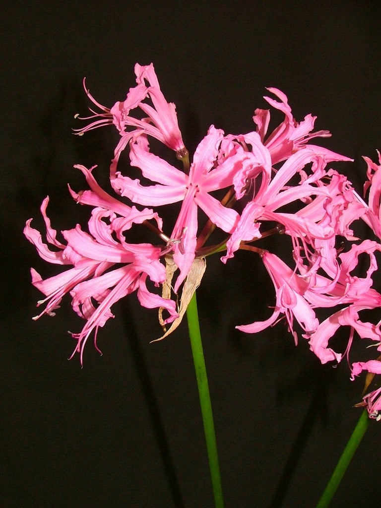 Nerine are summer-dormant, perennial bulbs with erect leafless stems each bearing a terminal umbel of funnel-shaped flowers in autumn, and strap-shaped or linear leaves appearing after the flowers
