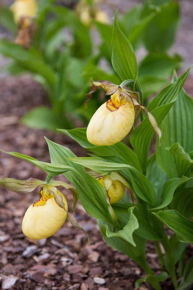 A deciduous orchid with bright green, prominently veined ovate leaves and upright stems bearing flowers in spring. Each flower comprises a cream to pale yellow pouch surrounded by twisted, burgundy-red to pale brown striped tepals