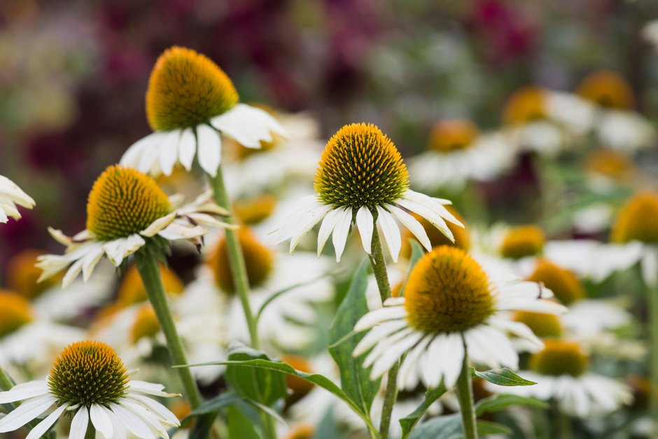 Echinacea are erect, clump-forming rhizomatous perennials with simple or pinnately lobed leaves and solitary, long-stalked daisies with prominent conical central disks and often drooping ray florets; attractive to butterflies