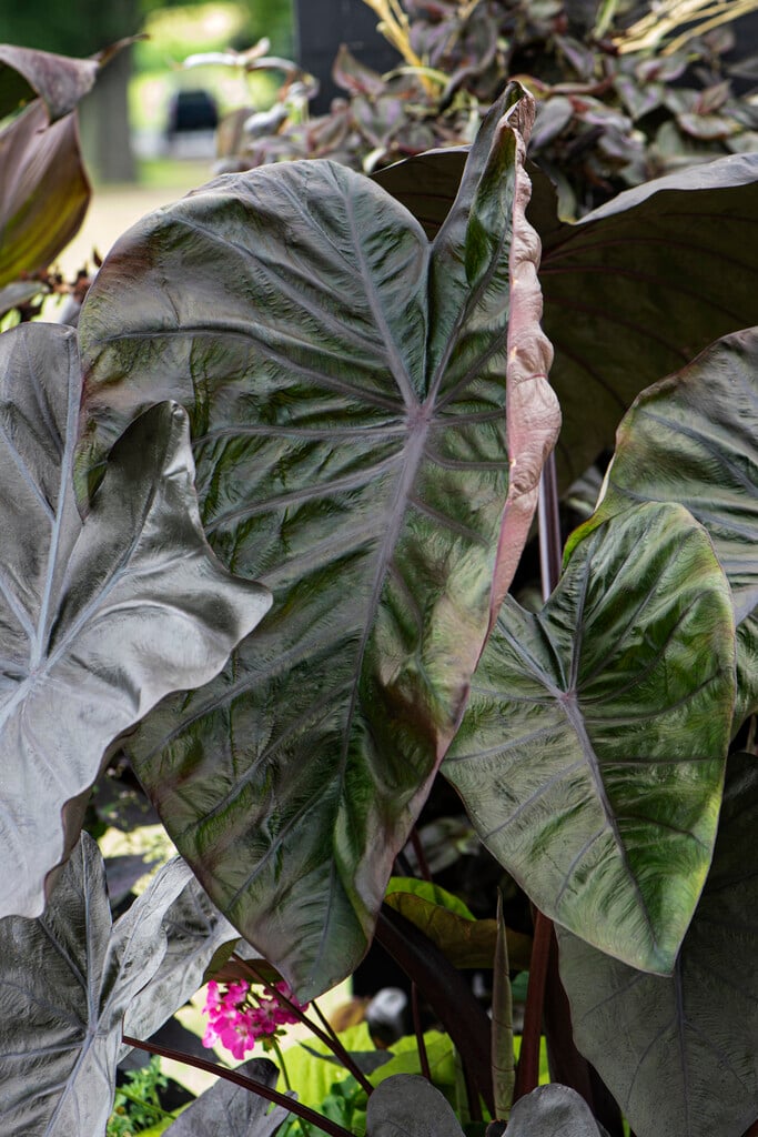Colocasia can be deciduous or evergreen, tuberous-rooted perennials with arrow-shaped or rounded leaves, often prominently veined; flowers are minute, on a spadix held within a small white spathe, but are seldom produced in cultivation