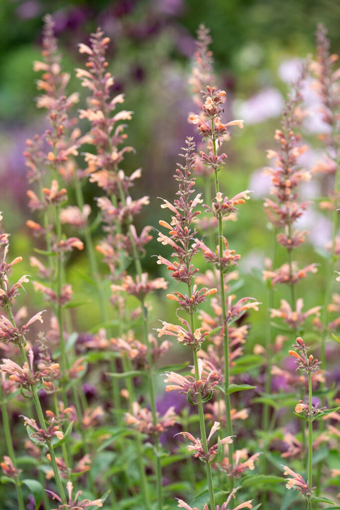 Agastache are herbaceous perennials with simple, aromatic leaves and small 2-lipped tubular flowers in whorls forming dense spikes, in summer and autumn; some are rather tender but can be grown as annual bedding
