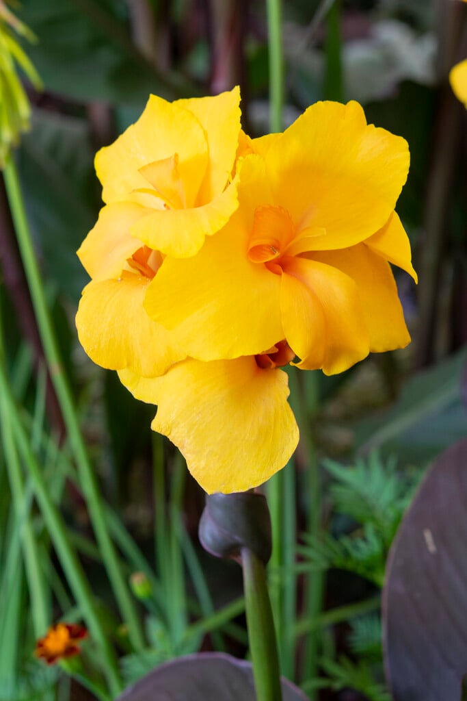 Canna are rhizomatous herbaceous perennials with erect stems bearing ovate leaves, with showy flowers with showy petal-like staminodes and small, coloured petals and sepals, borne in racemes or panicles in summer and autumn
