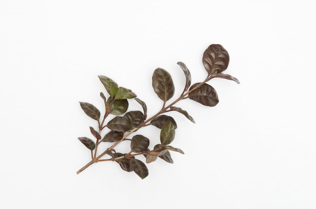 An evergreen shrub with small, round, slightly puckered, dark purple leaves. Mature plants produce small, white, scented, cup-shaped flowers with a mass of stamens in late summer, followed by black berries