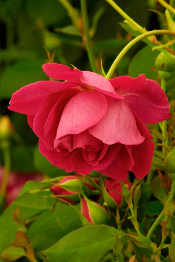 Rosa can be deciduous or semi-evergreen shrubs or scrambling climbers, with usually thorny stems bearing compound pinnate leaves and solitary or clustered flowers. Flowers may be followed by showy red or purple fruits in some varieties.