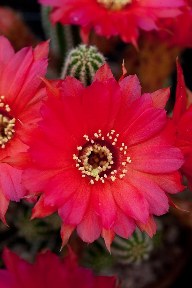 Echinopsis can have spherical or cylindrical, heavily ribbed and spiny stems, with funnel-shaped flowers in spring or summer