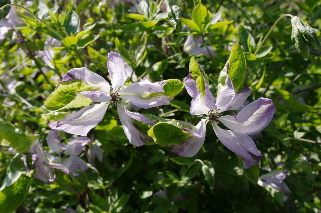 'Luxuriant Blue' is a deciduous climber reaching about 3m. Single flowers to 5cm in width, have four or five rather uneven, white petals suffused with purple round the edges and often tipped with green. Flowers mid-summer to early autumn