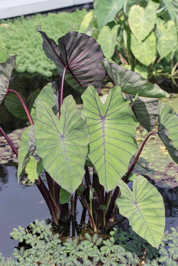 Colocasia can be deciduous or evergreen, tuberous-rooted perennials with arrow-shaped or rounded leaves, often prominently veined; flowers are minute, on a spadix held within a small white spathe, but are seldom produced in cultivation