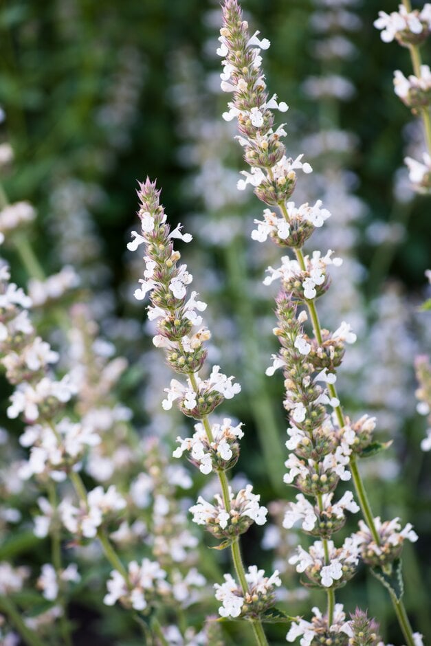 Nepeta can be annuals or, more commonly, perennials, with paired, usually aromatic leaves, and terminal spikes or panicles of 2-lipped, tubular flowers