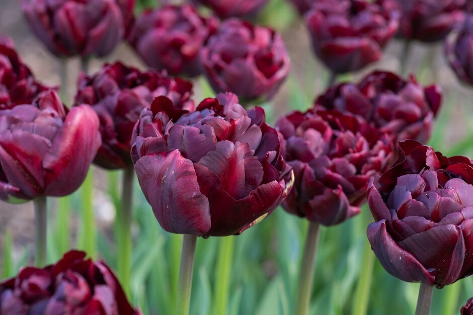 A perennial bulb with pale green, broadly lance-shaped leaves. Flowers are bowl shaped and full double, with petals a mixture of rich browns, deep crimson reds and dark purples; often redder in full sun. Flowers are approximately 40cm high and produced in mid spring