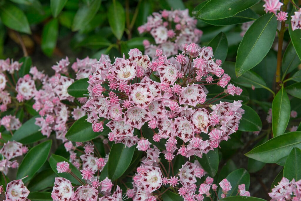 Kalmia are evergreen shrubs with simple, leathery leaves and racemes or corymbs of bowl-shaped flowers in spring or summer