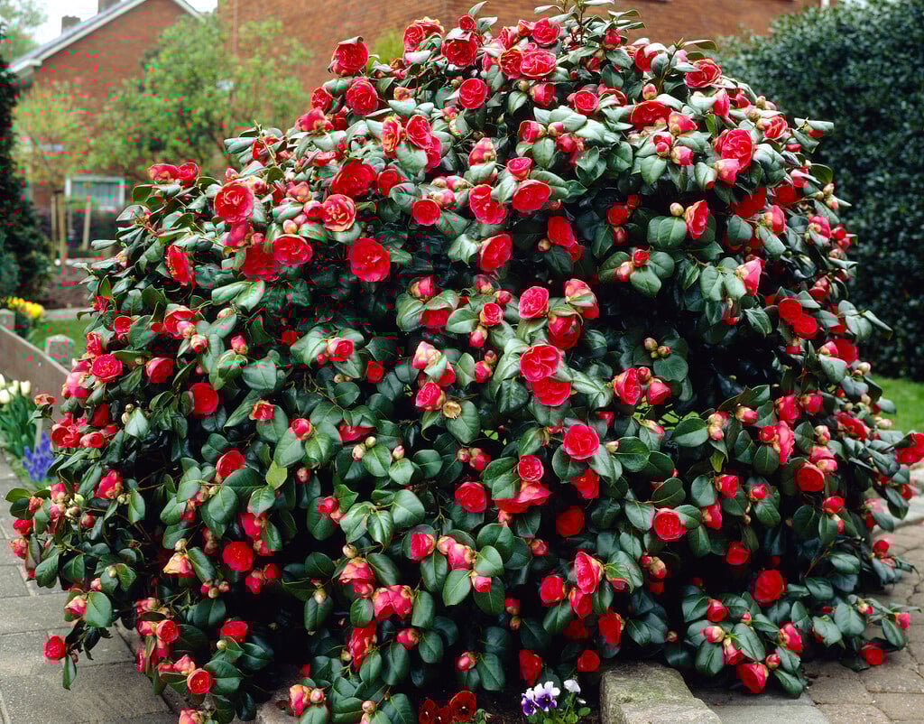 Camellia are evergreen shrubs with simple, ovate, glossy, leathery leaves and showy flowers with solitary or clustered flowers early in the year