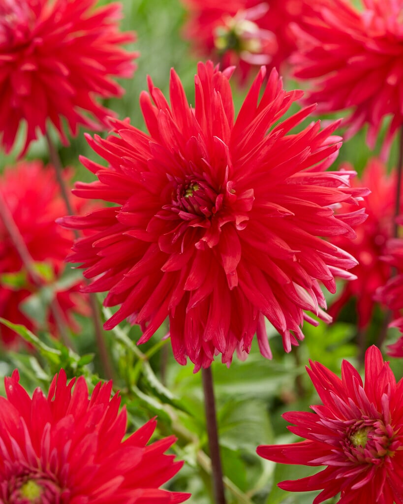 Tall, clump-forming, tuberous perennial to 1.2m in height with toothed, dark green leaves. This semi-cactus form has a profusion of very large, fully double, rich scarlet-red flowers to 20cm across, with long pointed petals, that bloom from midsummer until autumn