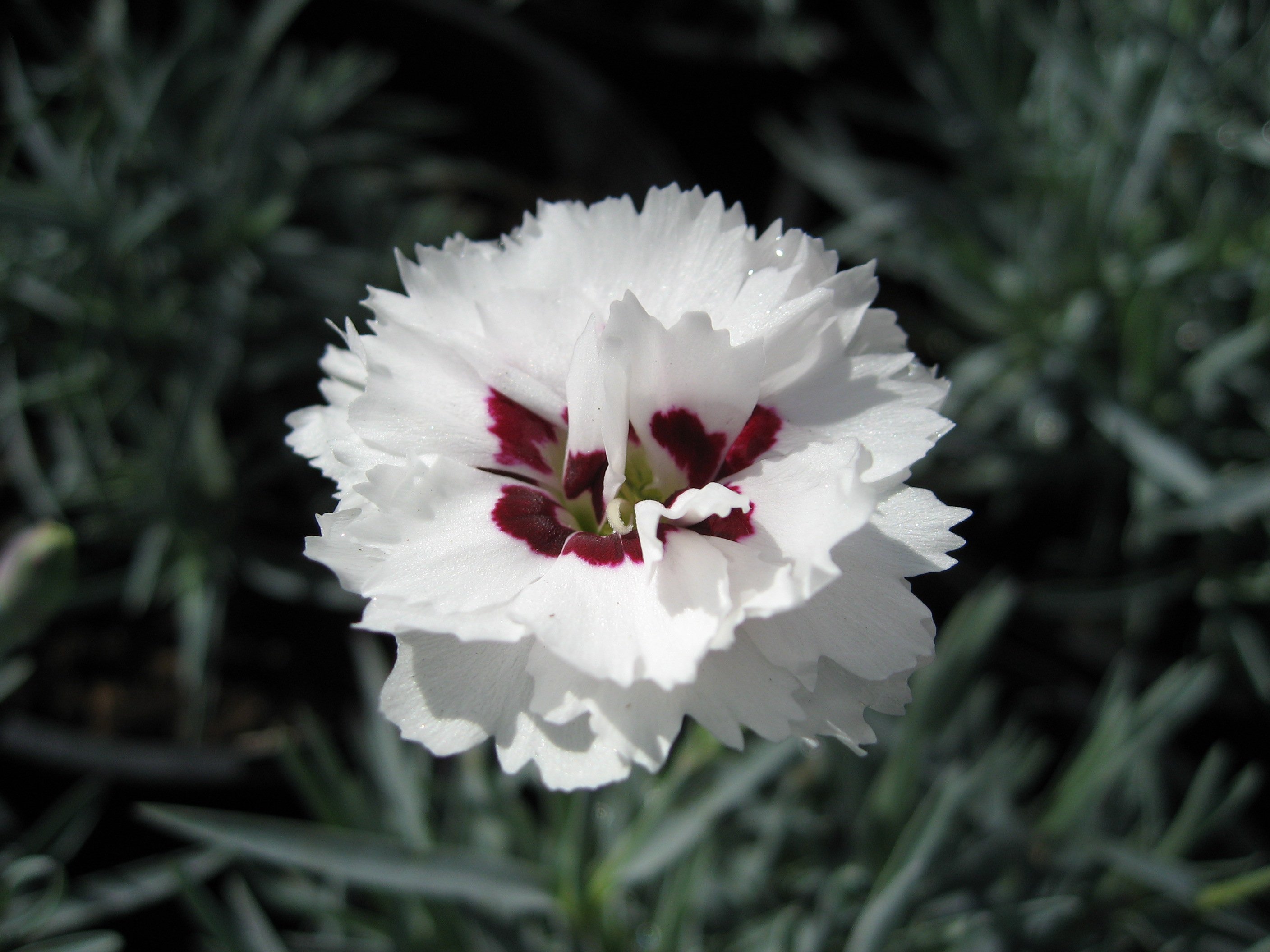 A compact, mound-forming evergreen perennial, to 20cm in height, with long, narrow, blue-green foliage. Large, semi-double, white ruffled flowers, with a maroon eye, are borne on erect stems from late spring to midsummer; flowers have a spicy fragrance