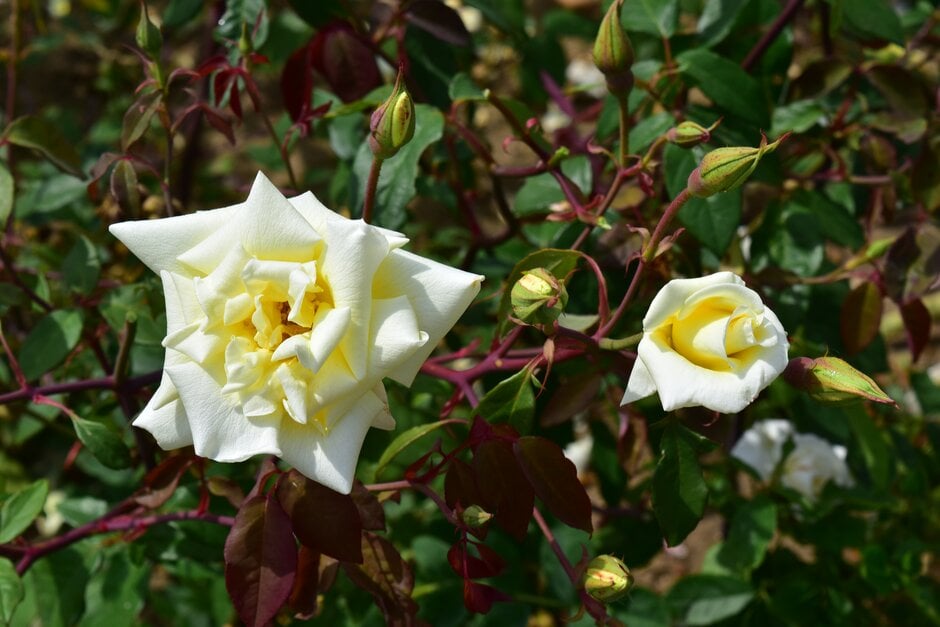 Rosa can be deciduous or semi-evergreen shrubs or scrambling climbers, with usually thorny stems bearing compound pinnate leaves and solitary or clustered flowers. Flowers may be followed by showy red or purple fruits in some varieties.