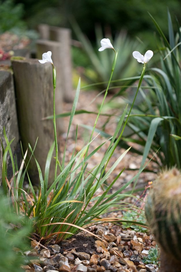 A clump-forming, rhizomatous, evergreen perennial to about 65cm. It has stiff, flat, narrowleaves and lightly scented flowers with three large and three small, white petals the smaller ones with yellow and purple markings