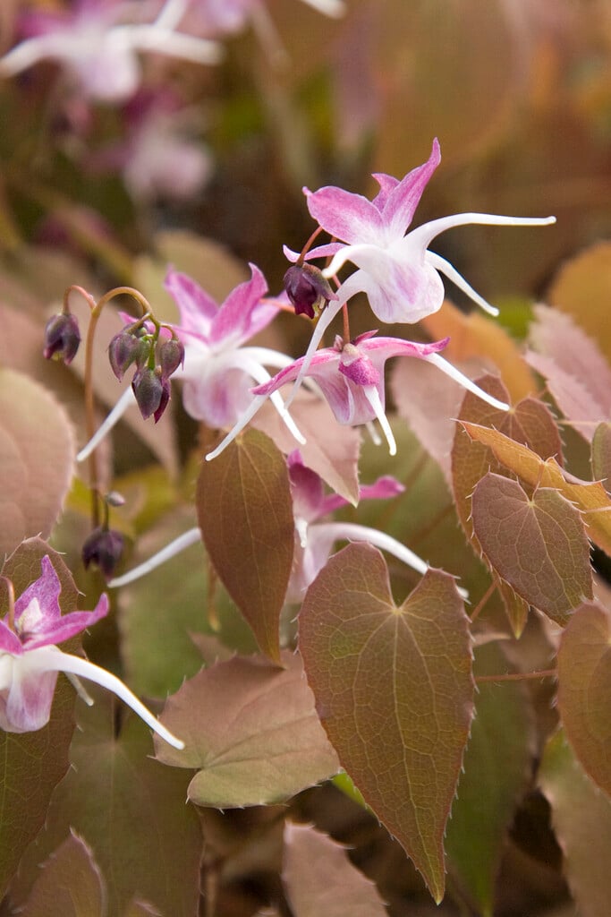 Epimedium are rhizomatous perennials with evergreen or deciduous, ternately or pinnately divided leaves, and open sprays of small, bowl-shaped flowers, often with prominent spurs, in mid to late spring