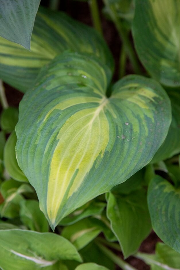 A medium-sized, slow-growing, clump-forming, deciduous perennial with creamy-yellow foliage variegated with a slightly wavy blue-green margin. Lavender purple flowers appear above the foliage during the summer