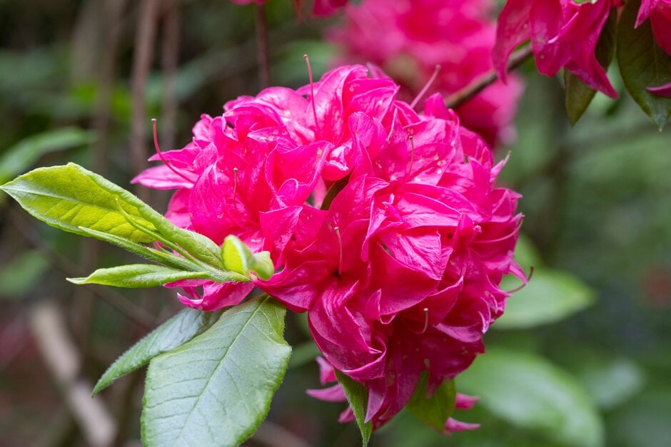 Vigorous and robust, deciduous Glendoick hybrid to 1.5m tall, with small, slender mid-green leaves, and rounded trusses of sweetly scented, dark pink double flowers, appearing late spring and early summer