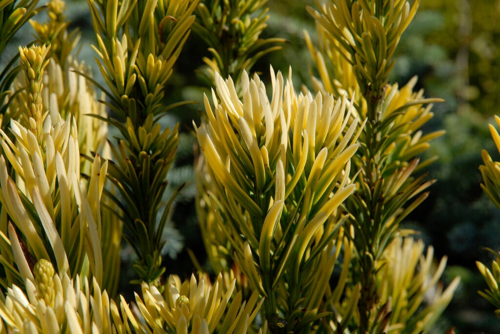Cephalotaxus are evergreen shrubs or small trees, with 2-ranked, linear leaves resembling yew foliage, and somewhat plum-like, fleshy green fruits; male and female flowers are usually on separate plants