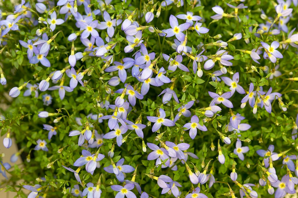 Evergreen alpine or perennial plant forming a low creeping mat or tufts about 15-20cm tall, of tiny evergreen leaves smothered by yellow-eyed, tiny blue star-shaped flowers to 4mm across, in late spring, and intermittently through summer