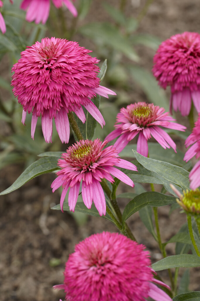 A highly compact, upright, perennial coneflower variety producing showy, double pink blooms from early-late Summer on short, yet sturdy stems. Flowers are 7.5cm across and have downward arching ray florets surrounding a large, central pompom with dark pink disc florets